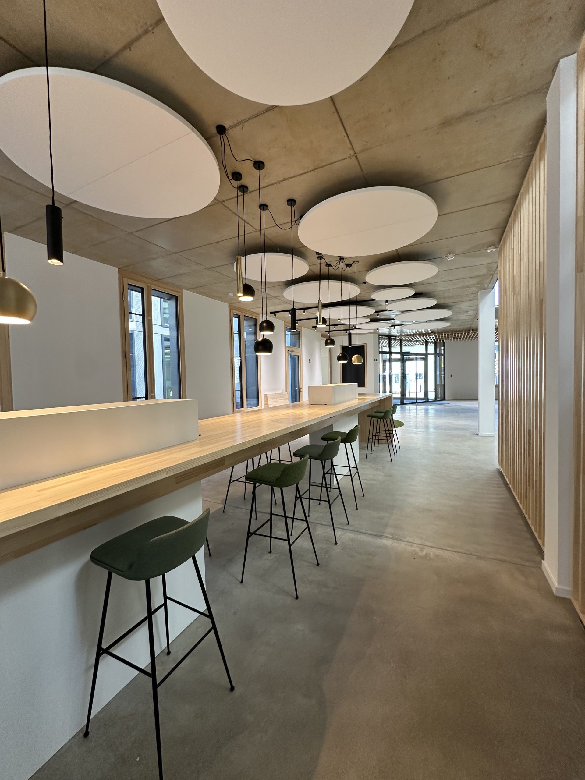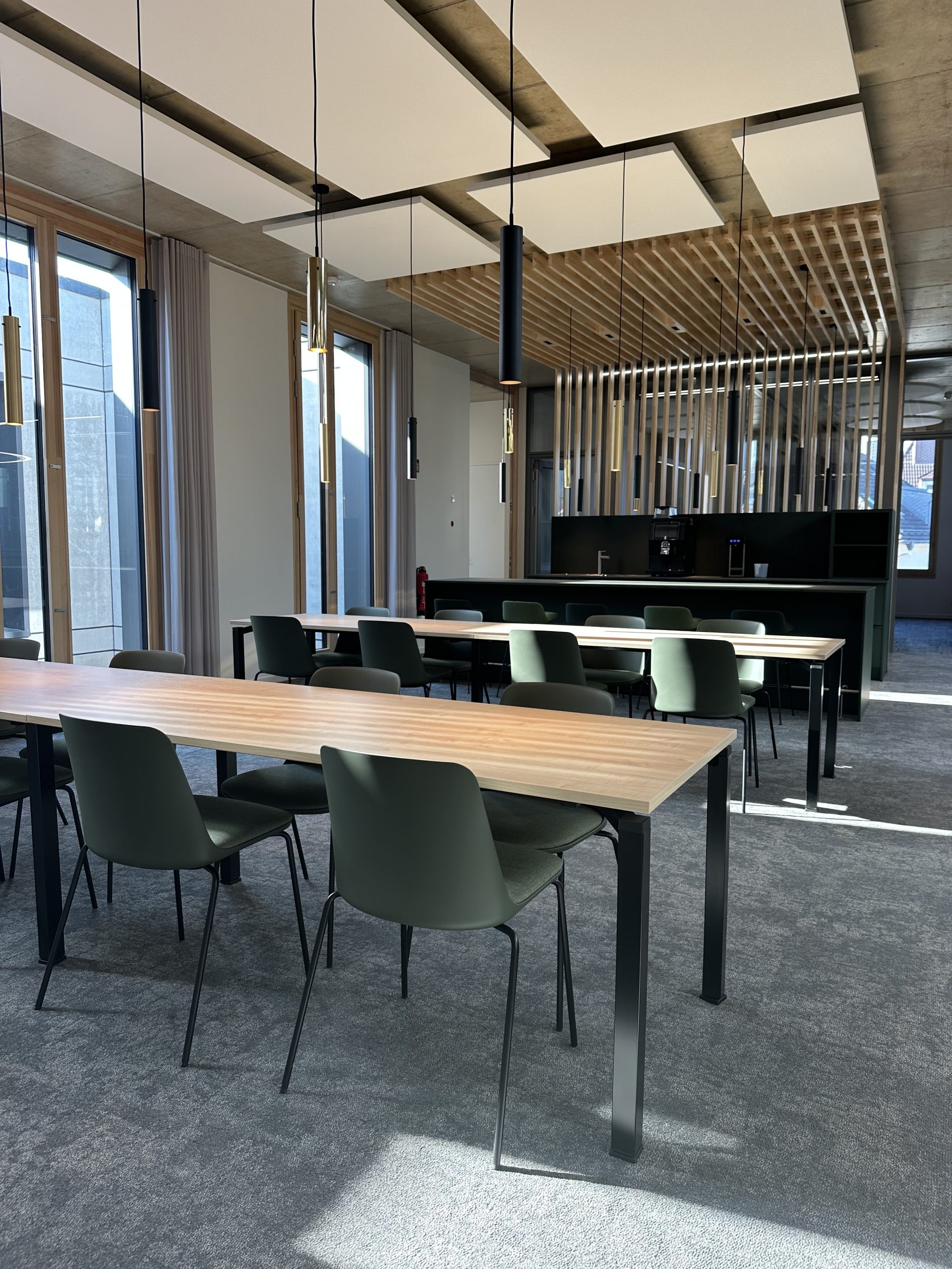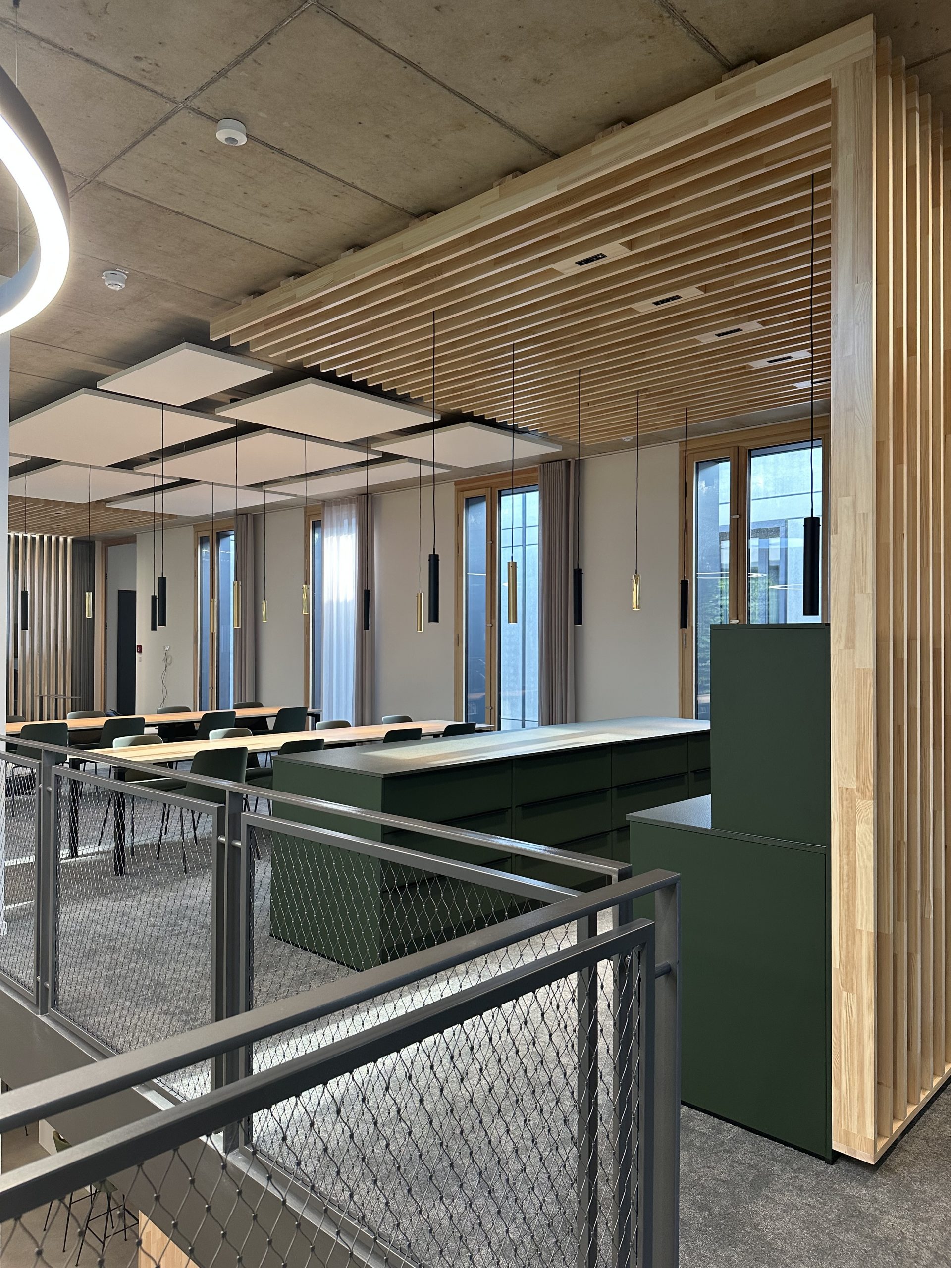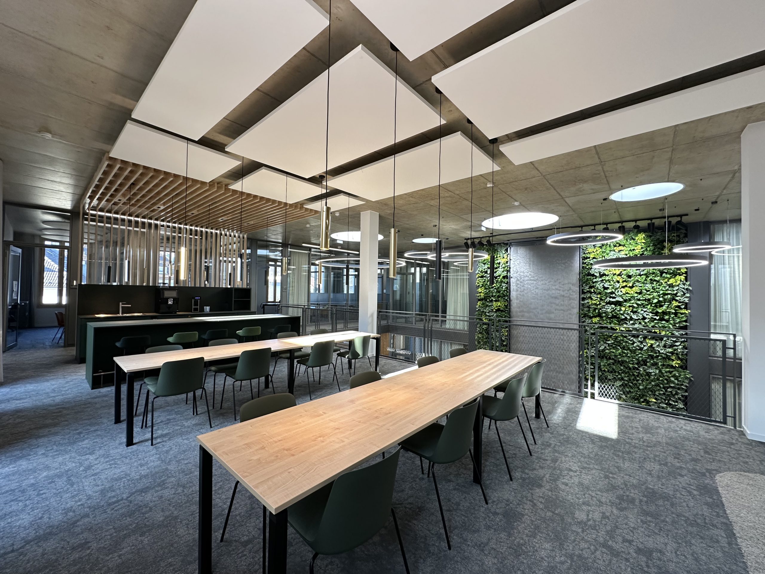 Sichtbeton, Holz und Teppichböden wurden hier als gestalterische Basis gewählt, sinnvoll ergänzt durch ein ausgefeiltes Akustik- und Lichtkonzept.