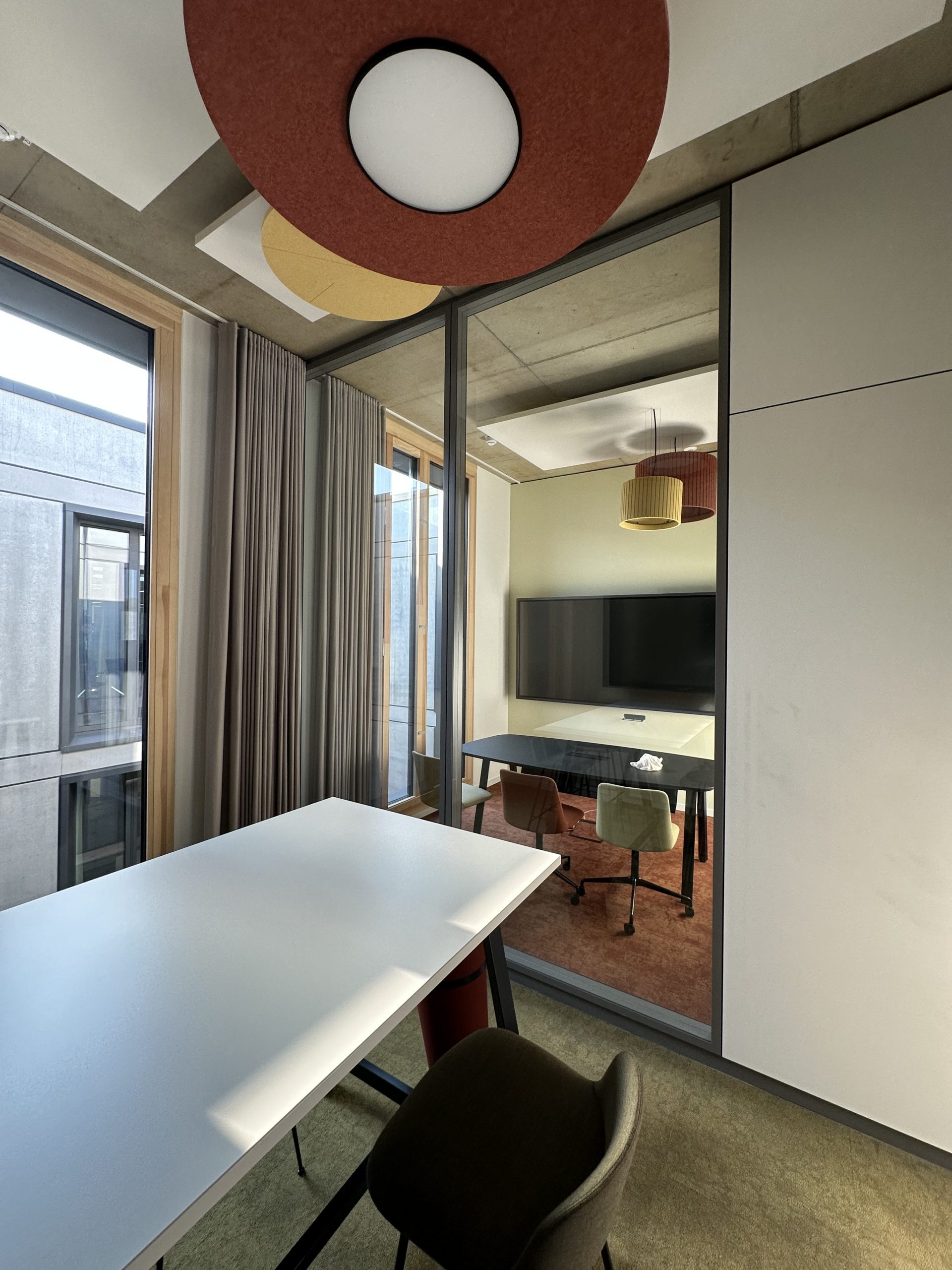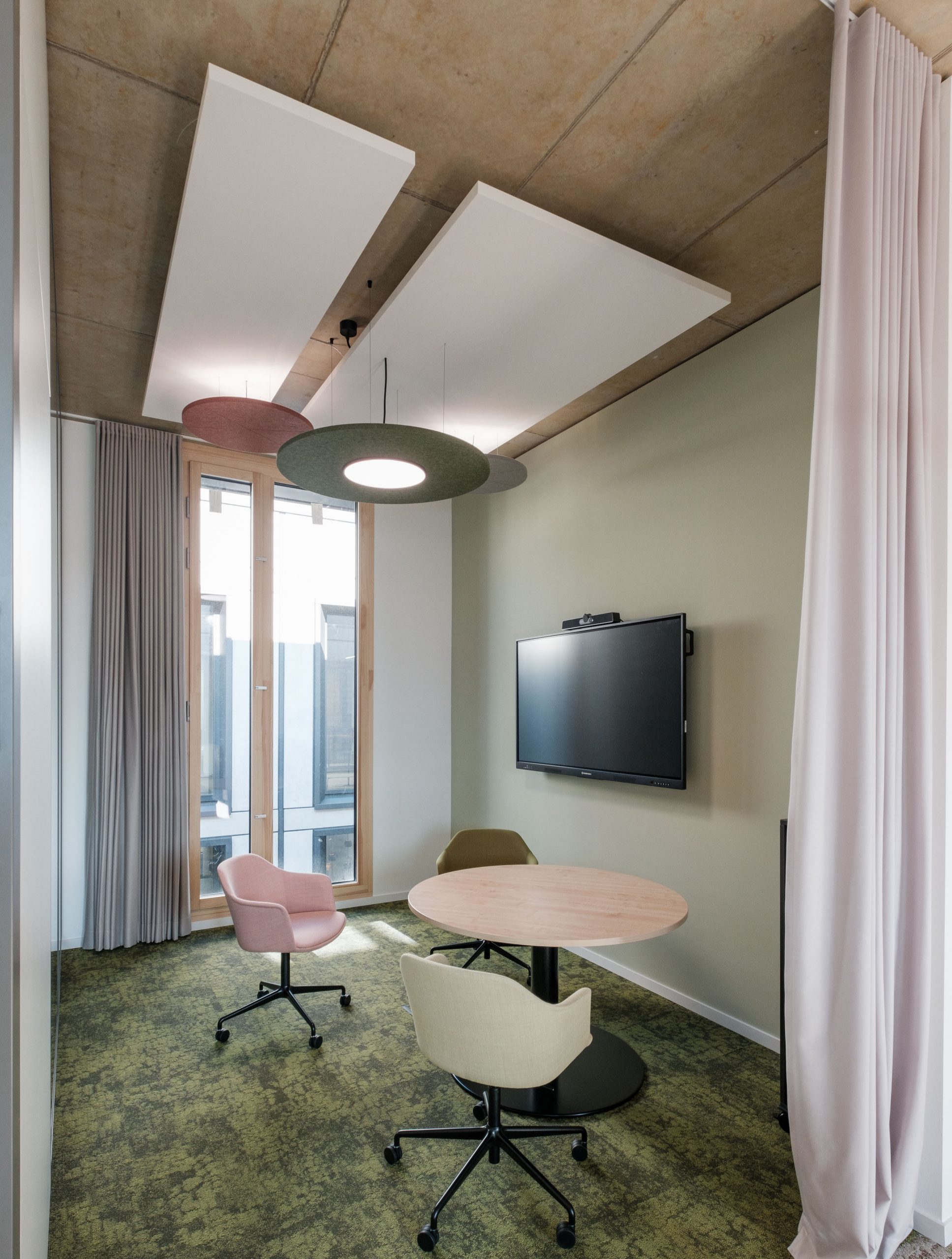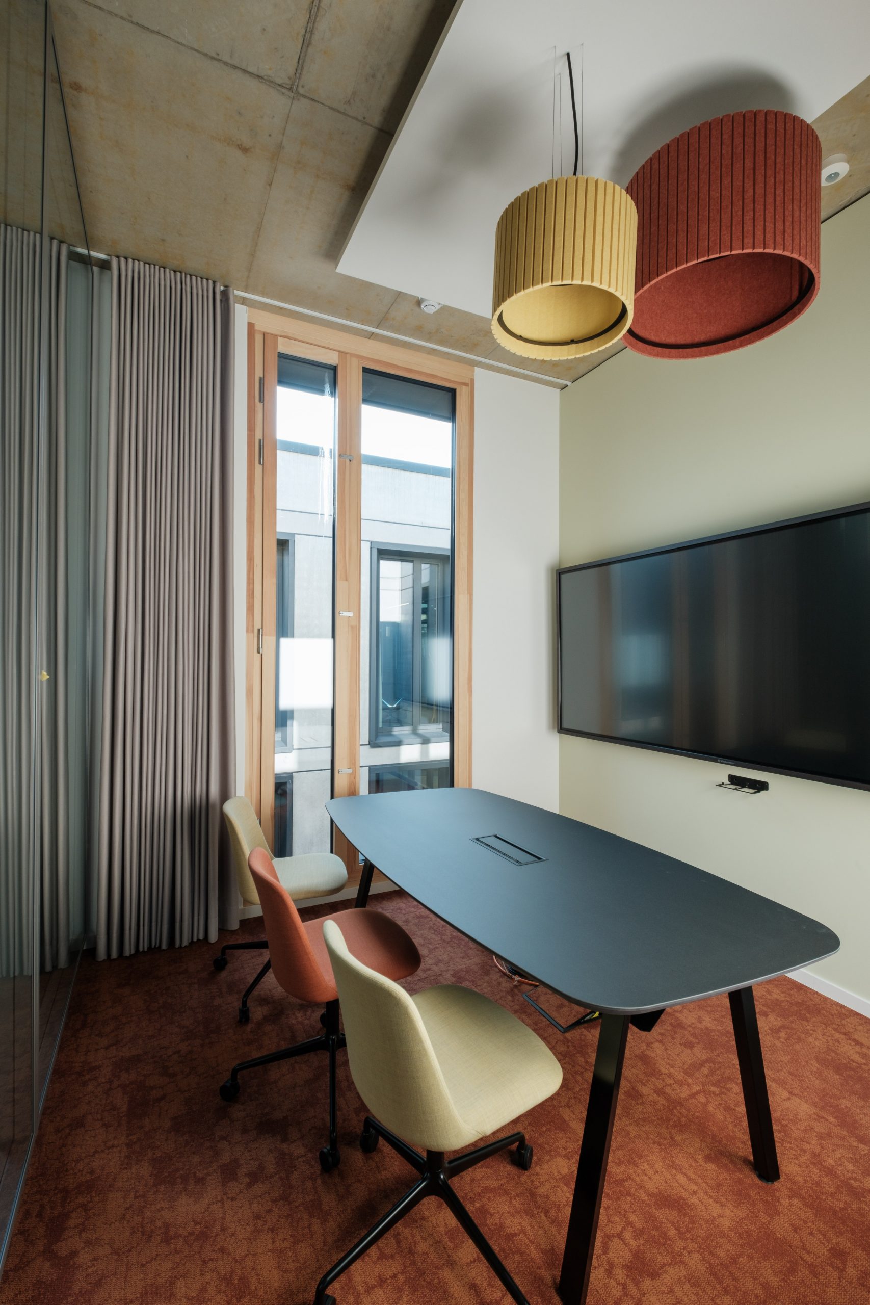 Sichtbeton, Holz und Teppichböden wurden hier als gestalterische Basis gewählt, sinnvoll ergänzt durch ein ausgefeiltes Akustik- und Lichtkonzept.