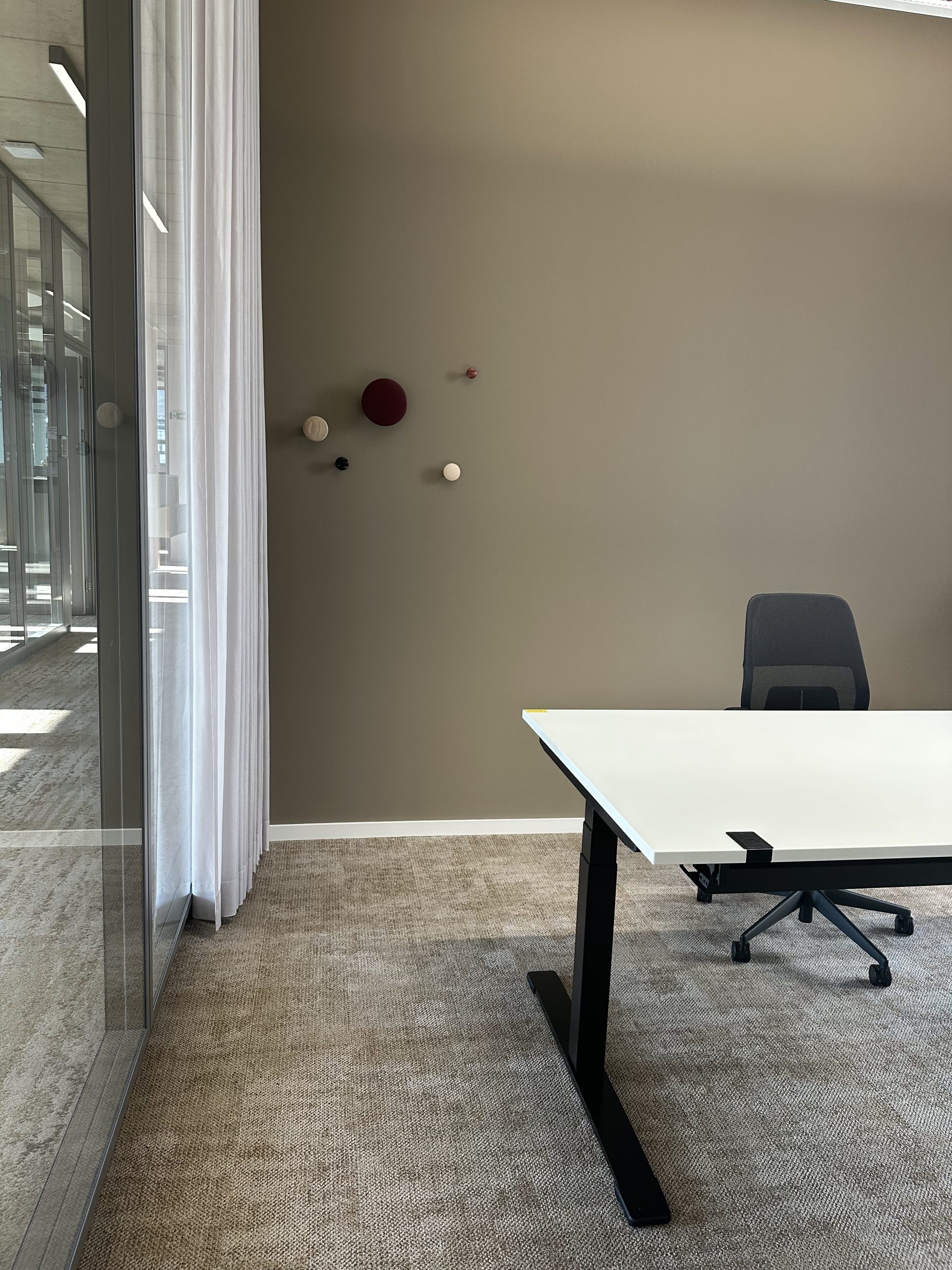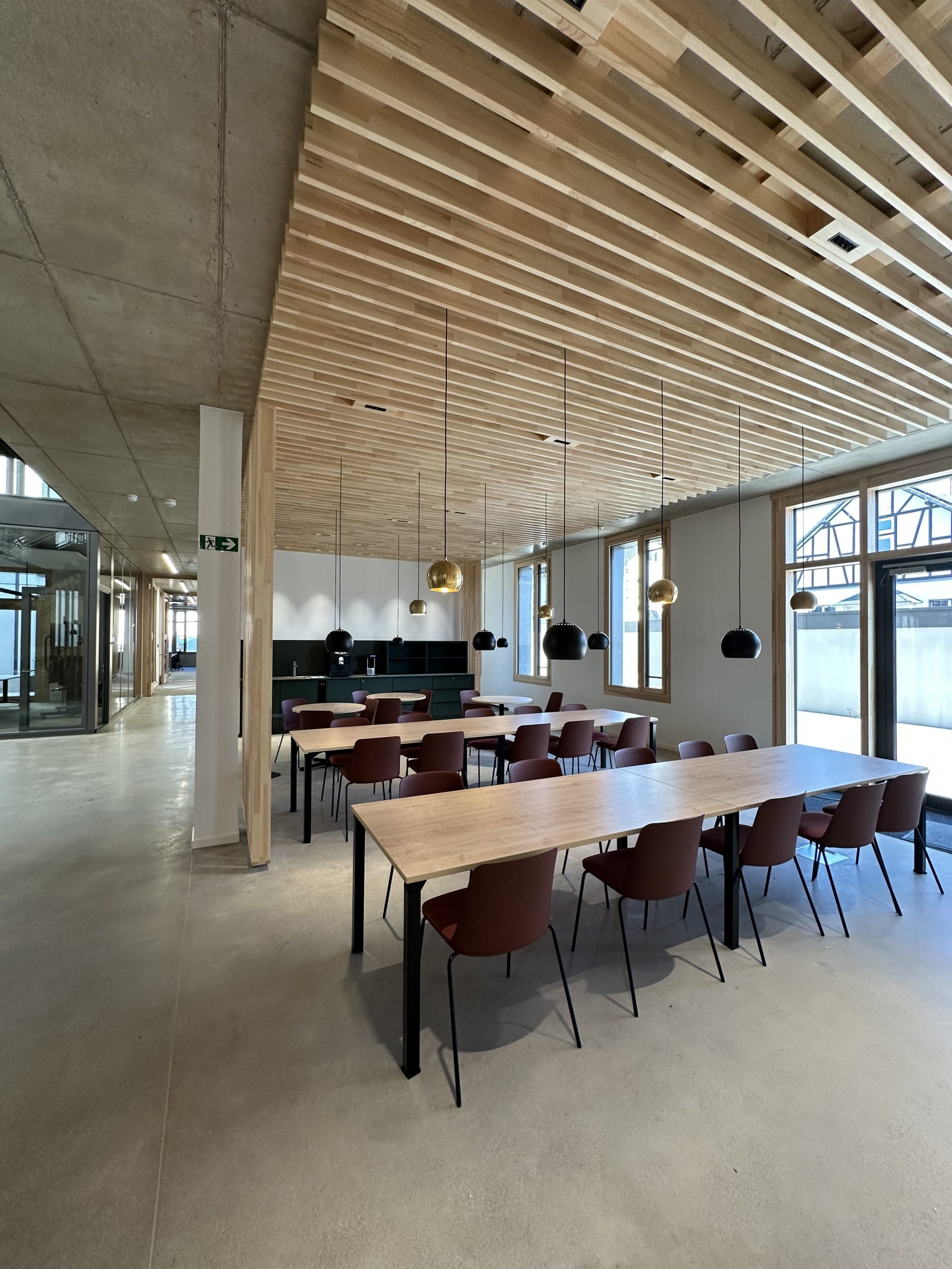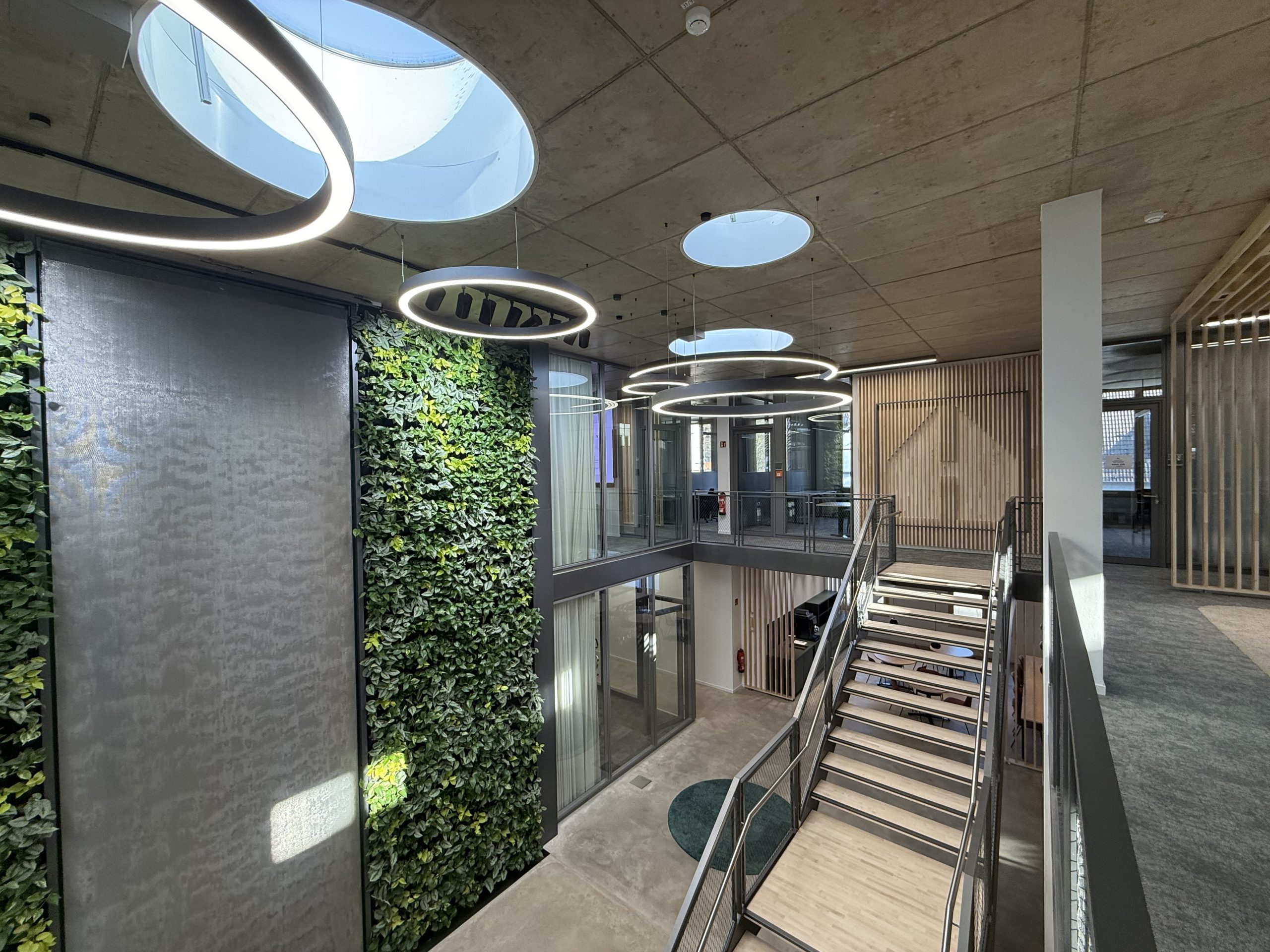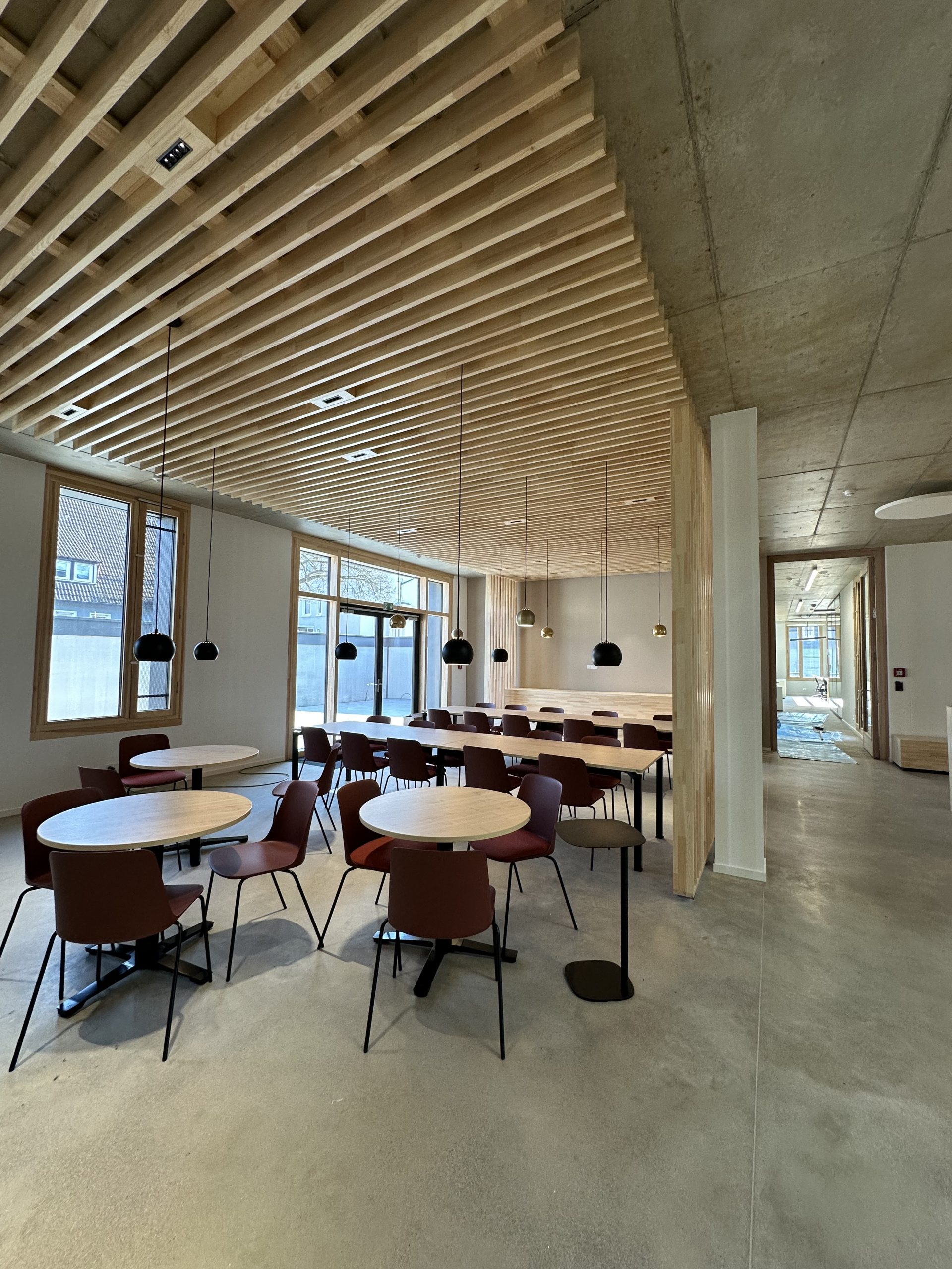 Sichtbeton, Holz und Teppichböden wurden hier als gestalterische Basis gewählt, sinnvoll ergänzt durch ein ausgefeiltes Akustik- und Lichtkonzept.